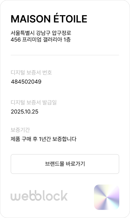 구매한 제품의 보증 정보와 구매 내역을 한 곳에서 확인할 수 있는 웹블럭만의 디지털 보증서입니다.